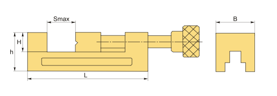 Подвижная и неподвижная губки обеспечивают быструю фиксацию заготовок. Неподвижная губка представляет собой цельную конструкцию, встроенную в корпус тисков. Подвижная губка зафиксирована с помощью зажимной планки и винтов, а также имеет горизонтальную и вертикальную проточку для надежной фиксации цилиндрических объектов. Расстояние между губками может изменяться от полного смыкания до максимального значения Smax данной модели.